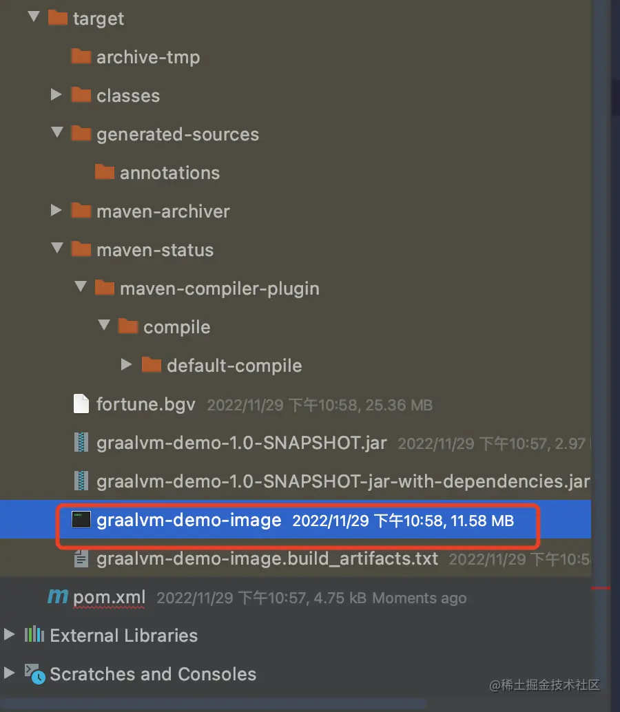 4、运行可执行程序包,打开 target 目录,已经看到了graalvm-demo-image可执行程序包了,大小为 11.58M。