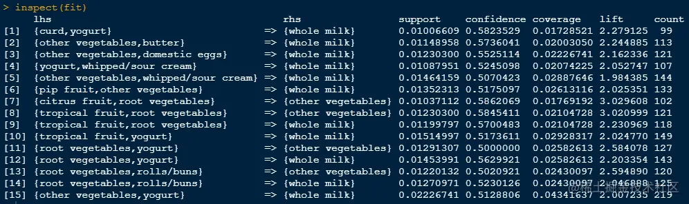 由于这个数据没有办法直接在r中展示出来,我们需要使用inspect()函数查看数据集的内容,展现出来的效果是类似于商品小票一样的数据