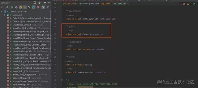 可以看到 DefaultSqlSession 实现了 SqlSession 中的方法,(其实我们自己也可根据需要去实现)。而在 DefaultSqlSession 类中有一个很重要的属性,就是 Mybatis 的执行器(Executor)。