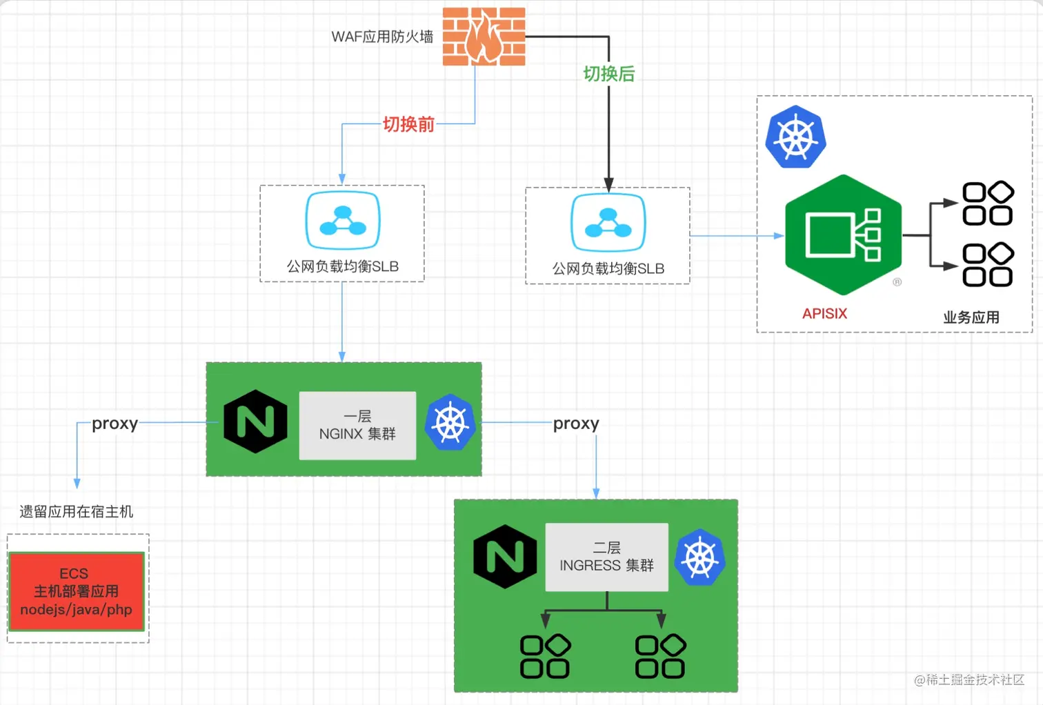 虽然前边我们已经使用了 goreplay 进行流量录制回放,但我们仍然需要一个比较可靠的回滚方案。假设流量切换造成了异常,比如转发异常或者是 APISIX 出现崩溃时,能够进行快速回滚操作。基于此,我们首先切换了公网流量,因为公网是通过 WAF 回源到 SLB 来进行流量切换的,这时如果我们切换到 APISIX,就可以很方便地去修改回源地址来将整个流量进行回滚,如上图标注「切换」字样所示。这个异常情况下的流量切换过程基本是在秒级别,可能 10 秒内就把所有流量都切回来了。