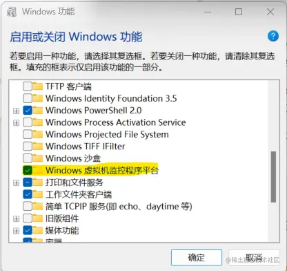 四、如果vagrant up启动不成功或者启动时间很久,另外还需要在windows功能中选中windows虚拟机监控程序平台