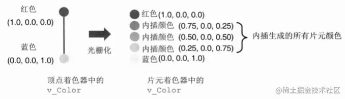 我们只对每个顶点设置了颜色,每一个片元的颜色需要怎么确认呢,顶点着色器的v_Color传递到片元着色器的v_Color之间进行了内插的过程,如果是两个顶点,就会对两个点进行插值获取到中间的颜色,所以片元着色器会因为位置不同而渲染不同的颜色。