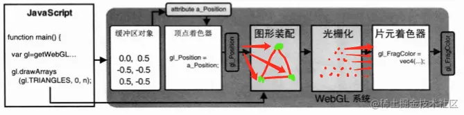 为什么会得到这样的结果呢,再来理解一下两个着色器,我是这么理解的,顶点着色器会在处理每个顶点时执行一次,片元着色器是每个像素都会执行一次,片元着色器不会属于一个顶点所以不能使用attribute变量。在顶点和片元之间还会存在下面两个步骤: