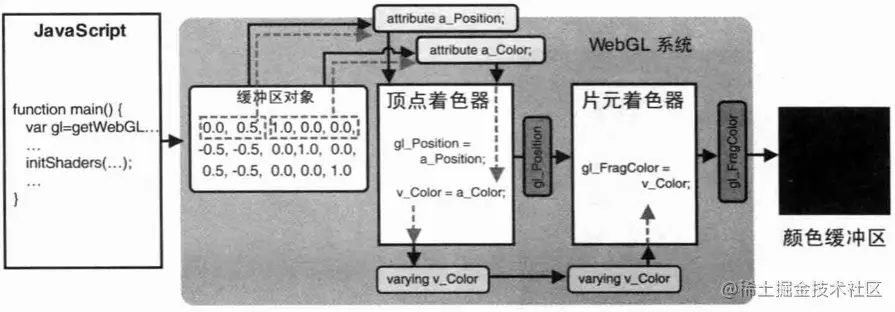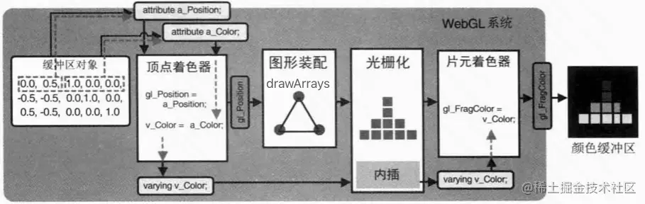 在顶点着色器中声明了attribute变量a_Color接收缓冲区的数据。声明varying变量v_Color,把a_Color的值传递给v_Color。