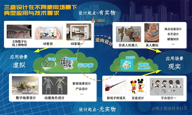 而这两种模型结果最终的使用方向,无外乎两种:用在现实世界中;用在虚拟空间中。(如下图所示,三维设计涉及人们生活中的方方面面)
