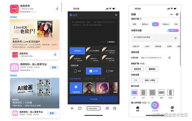 现在,除了意间绘画小程序和draft.art网站,如美图秀秀、美颜相机这种扎根于美化人像的软件也立刻释放了AI绘画功能。