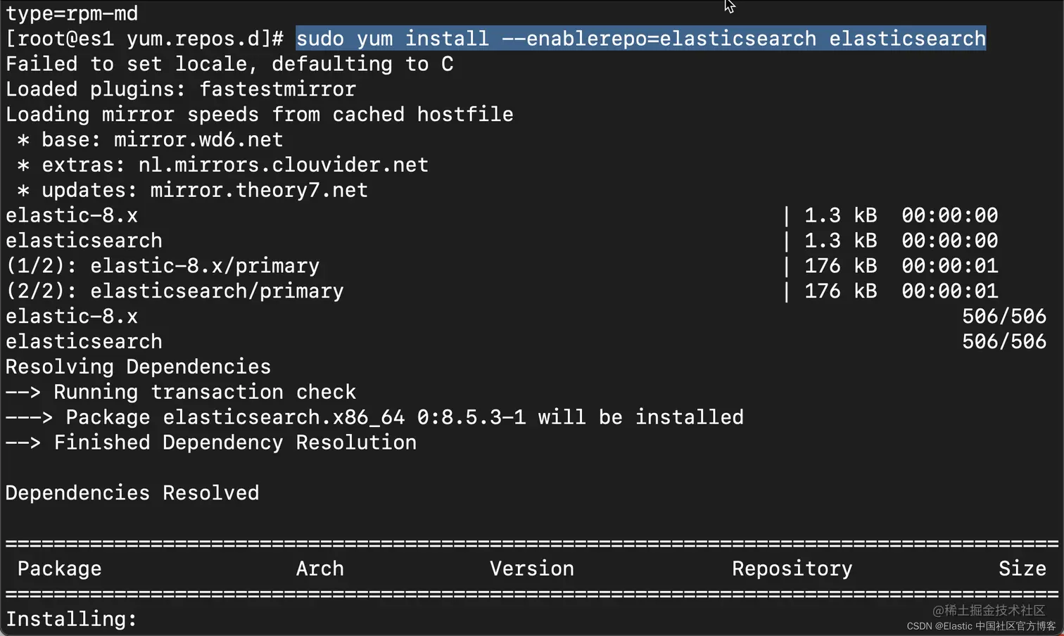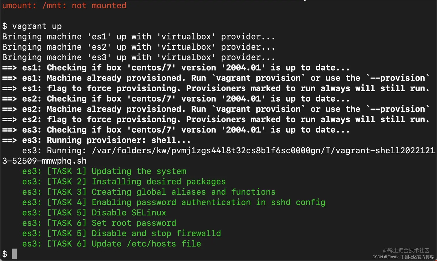 如上所示,在更新完系统后,上面的错误信息就不见了。我们需要为 es2 及 es3 重复这个步骤。 等全部安装完毕后,我们可以使用如下的命令来查看: