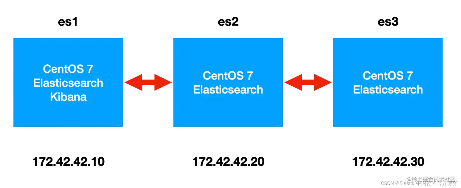 在我之前的文章 “Elasticsearch:使用 RPM 安装包来安装 Elastic Stack 8.x” 里,我详细地介绍了如何使用 RPM 安装包来安装 Elastic Stack 8.x。在今天的文章中,我来详细描述如何从零开始来创建一个含有三个节点的 Elasticsearch 集群。我们最终实现的是如下的 Elasticsearch 集群。