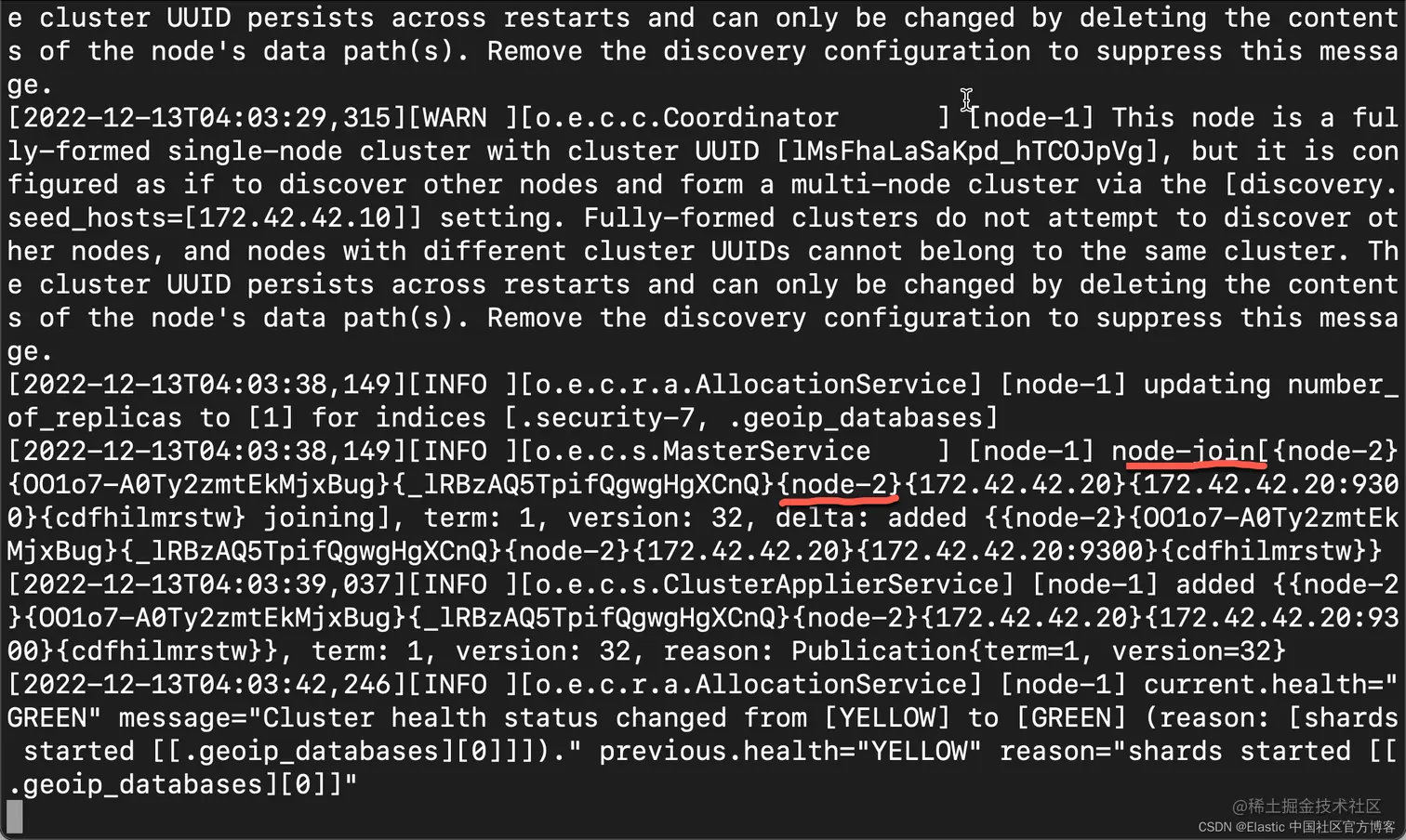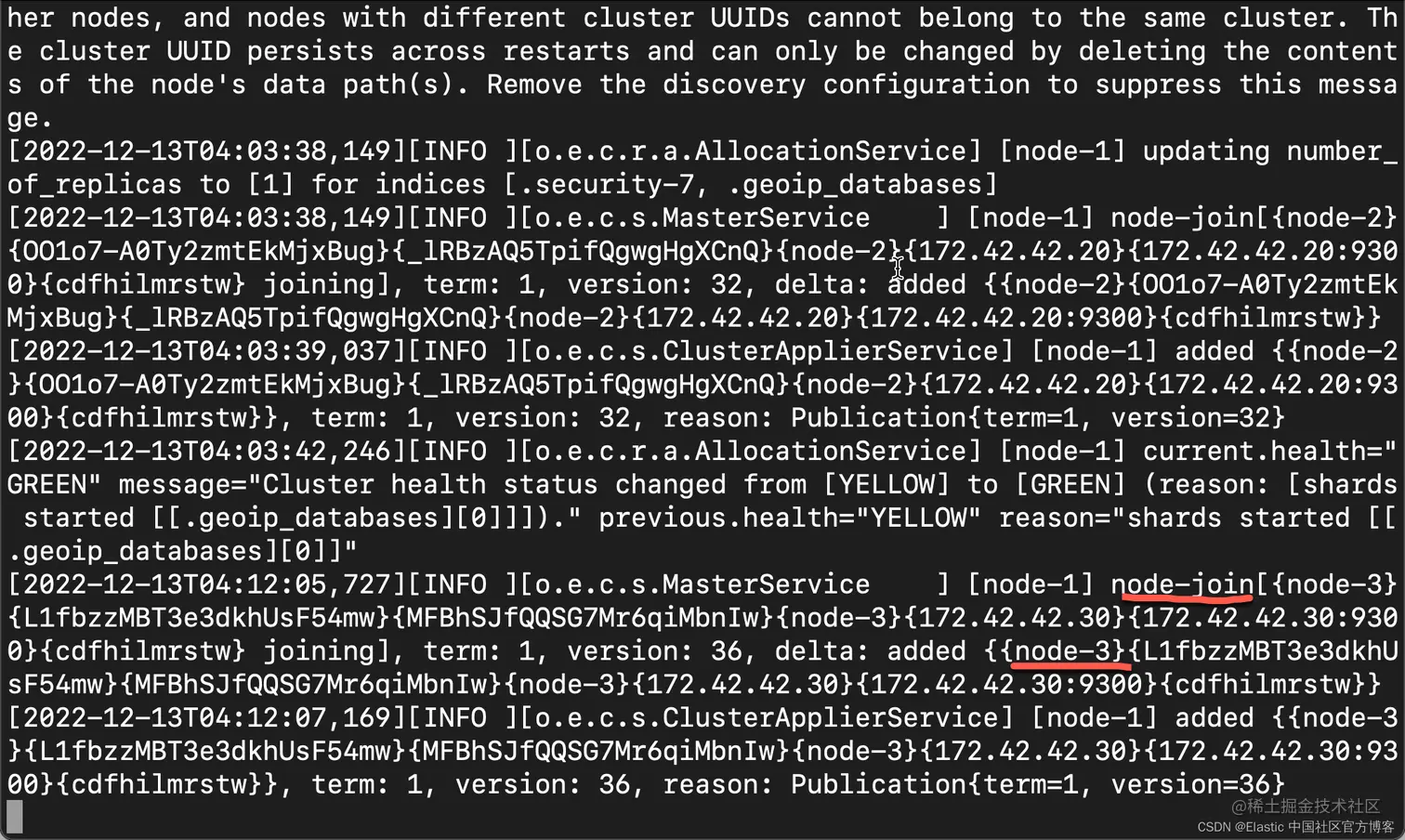我们可以在 es1 的 log 里看到如下的信息: