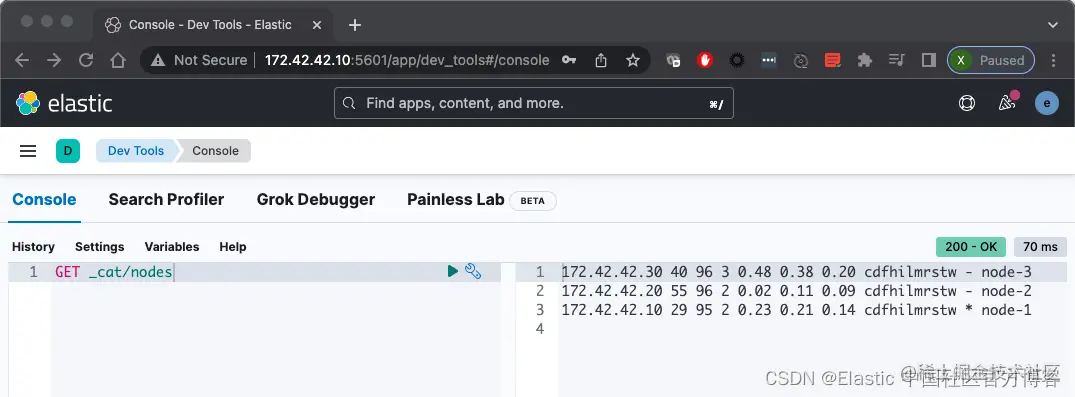 这样我们就进入到 Kibana 的界面了。我也可以在 console 中查看 nodes 的情况:
