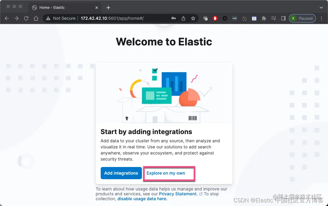如上所示,我们可看到让我们去启动 Kibana 的链接。我们在浏览器中输入地址:http://172.42.42.10:5601/?code=203501