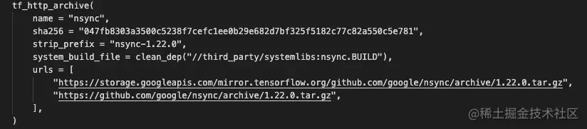 进入 tensorflow tag v1.15.0 源码目录,打开 tensorflow/workspace.bzl 文件,找到其中 name 为 nsync 的 tf_http_archive 定义,如下: