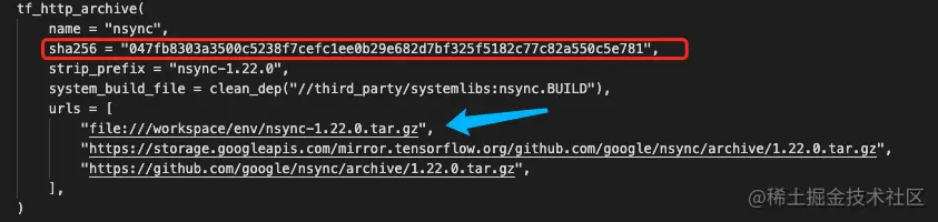 回到第(2)步中的 ~/tensorflow-1.15.0/tensorflow/workspace.bzl,修改 sha256 = 为第(5)步生成的校验码,在 urls = [] 中新增 nsync-1.22.0.tar.gz的绝对路径,如下:
