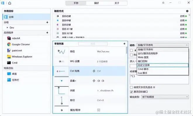 平时用电脑工作,一手键盘一手鼠标总是忙不过来,这是一款免费且开源的国产鼠标手势软件,让你用鼠标代替键盘的一系列快捷键,基本手势包括复制、剪切、粘贴、前进、后退,简简单单的线条滑动,没有花里胡哨的手势,还支持定制手势。