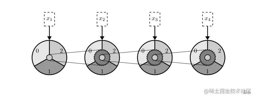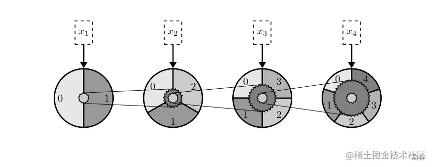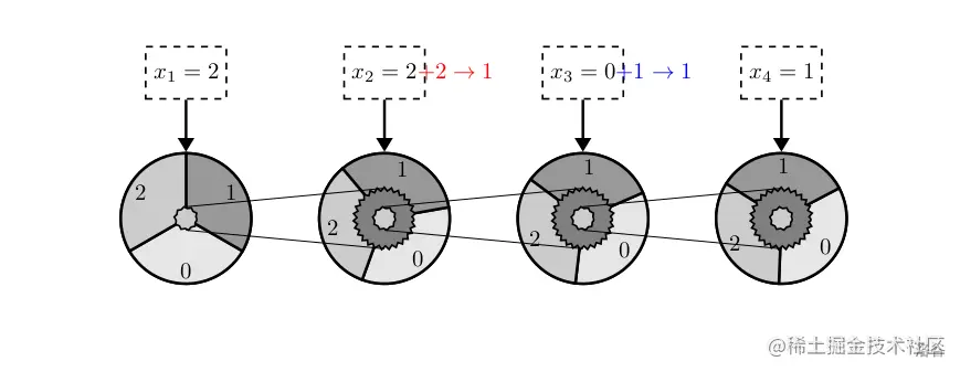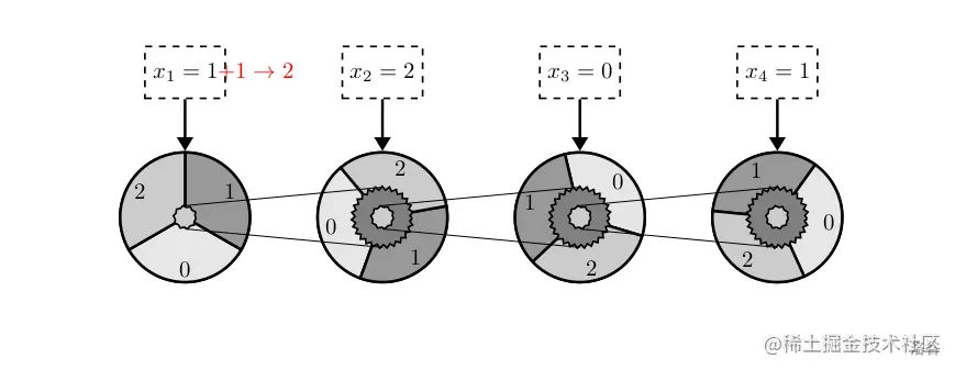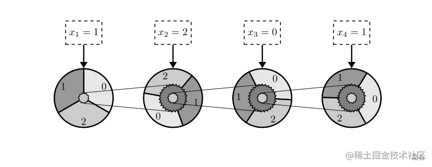 现在莲子设计了如下图所示的机械结构。对于从左往右数的第 枚齿轮,它上面的浅色小齿轮与第 枚齿轮上的深色小齿轮的半径之比为 。也就是说,第 枚齿轮每转动 圈,第 枚齿轮转过的角度恰好为它上面的一个数码。