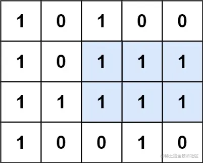 输入:matrix = [["1","0","1","0","0"],["1","0","1","1","1"],["1","1","1","1","1"],["1","0","0","1","0"]]