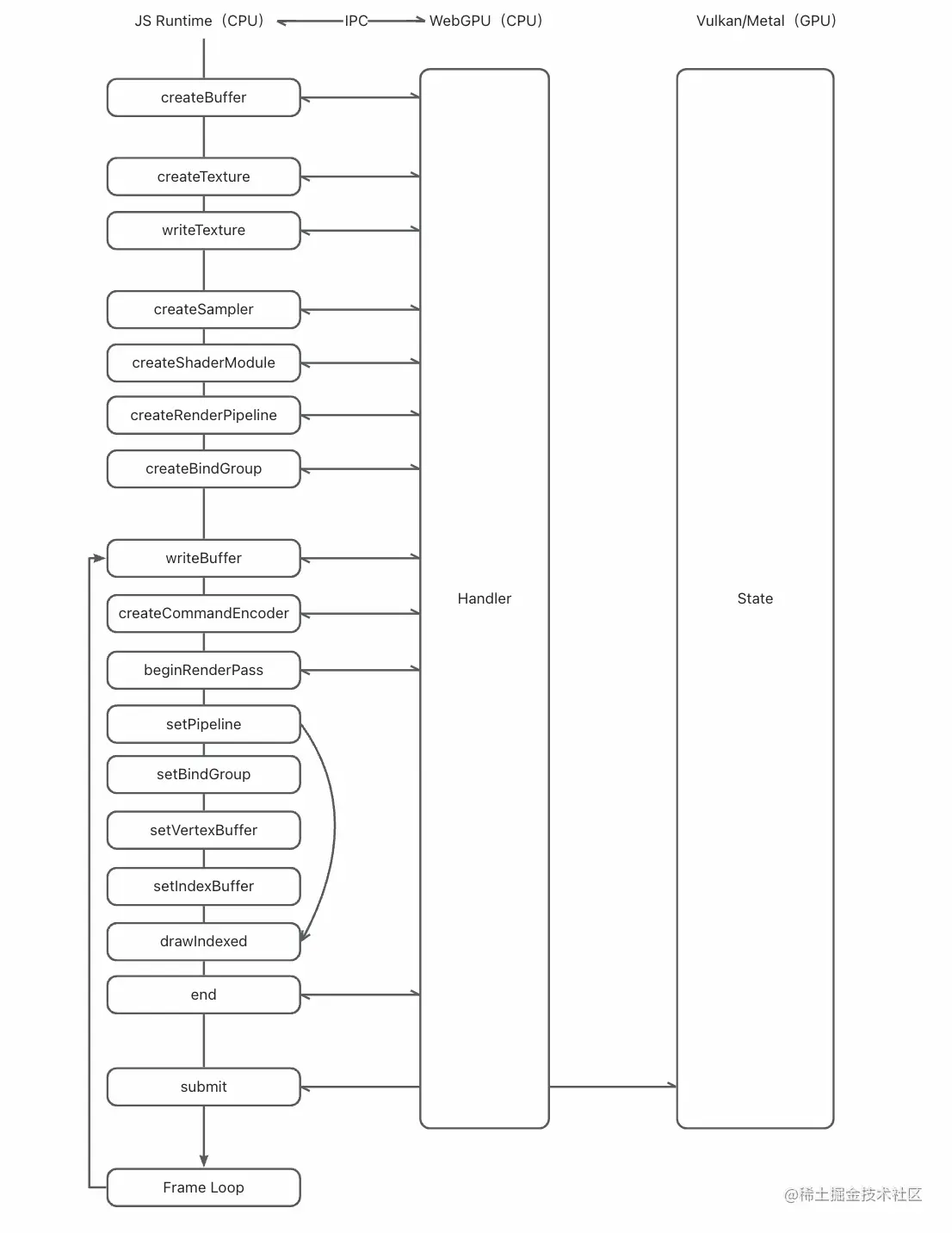 WebGPU 的工作就像是一套异步的指令集,它会将所有的指令按顺序暂存在 CPU 内存中,并在合适的时机批量提交给 GPU,并且这样的指令操作可以在多个 Worker 中并行进行,不会阻塞 JS 线程。
