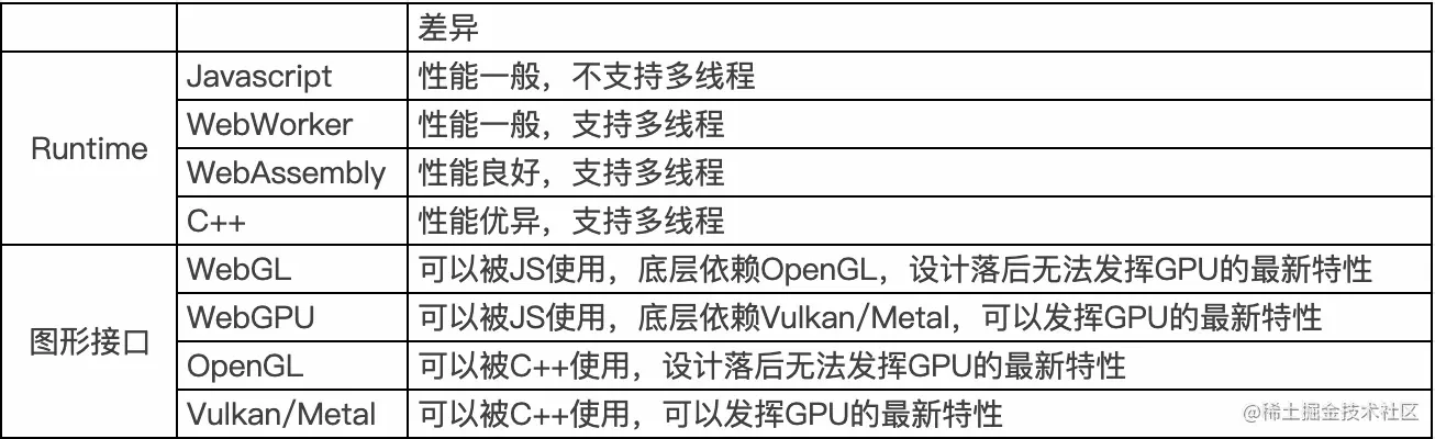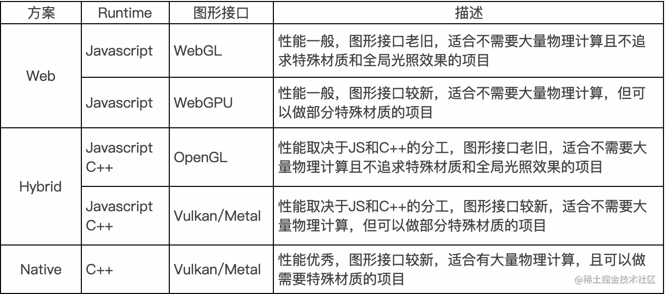 所以,如果要选择 Hybrid 方案来弥补 Web(WebGL)的一些性能劣势,那么可以自研一套 WebGPU 标准的 API(指上述方案 1)或者将一部分渲染或核心功能下沉到 Native 中实现(指上述方案 2、3)。至于这两种孰优孰劣就看业务需要什么、需要给前端多少研发自由度了。