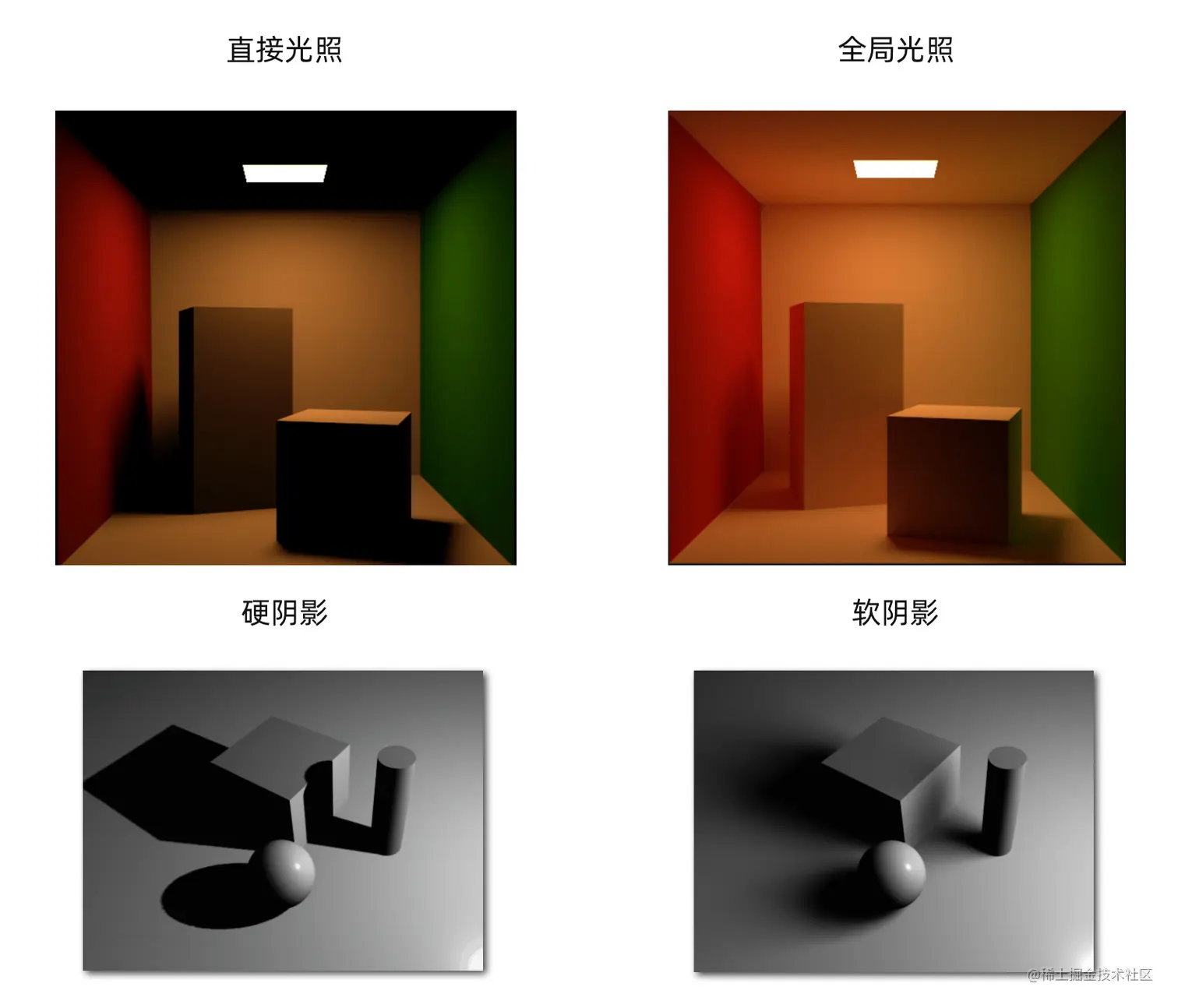 - 光照、阴影:光照和阴影是提升物体部位细节的重要手段,不同的材质对光照和阴影的计算要求也不尽相同。光照也分为直接光照和全局光照,阴影也分为硬阴影和软阴影,对计算要求也不尽相同。