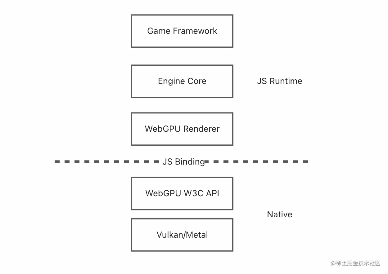 方案 1:此方案为 JS 提供了最新的图形接口,并且始终遵循 W3C 的标准 API,它的动态灵活性保持的较好,且我愿意称这类方案是对 Web 社区友好的方案,因为它的诞生是能天然适配市面上大部分 Web3D 引擎的。例如 CocosCreator、淘宝小程序(FCanvas)、微信小游戏用的都是类似的 Hybrid 方案(主要实现 WebGL API 标准)。通过遵循 WebGPU 的 API 标准,可以让这个方案获得比 WebGL 更好的显卡特性支持,可以实现更高级和特殊的材质效果。