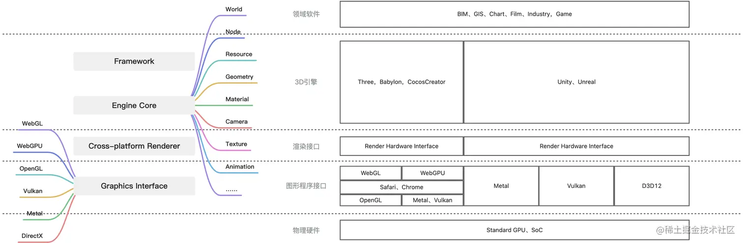 在 WebGPU 还未成熟之前,Hybrid 抑或是另一种折中或过渡阶段的选择。因为 Hybrid 可以让 Web 享受到最新图形接口带来的好处,但同样需要牺牲因部分能力下沉到 Native 实现而丢失的动态性。丢失的动态性多少取决于 JS 和 Native 实现功能分工。为了说明这个影响,我们先来看下大部分 3D 引擎的一个分层架构: