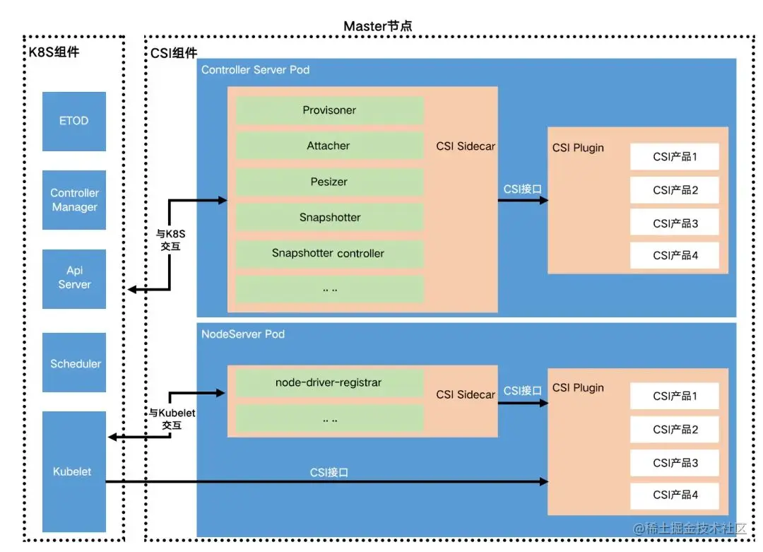 形象地说,CSI就是容器和存储之间的翻译官,并以存储代理人的身份,满足容器关于存储的一切要求。而各类容器编排系统(如K8S),则是这一切标准的制定者,满足CSI规范的组件都可以接入进来,成为容器和存储之间的桥梁,这些组件被称为CSI插件。