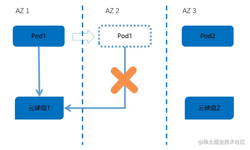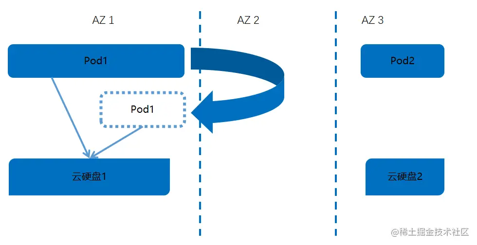 在容器存储不支持多AZ的情况下,CStor-CSI针对AZ级别资源的使用情况如下所示:Pod的调度并不受控制,根据K8S的调度算法,将随时可以在其他AZ上运行,这样新建的Pod,是无法享受原AZ内资源的。