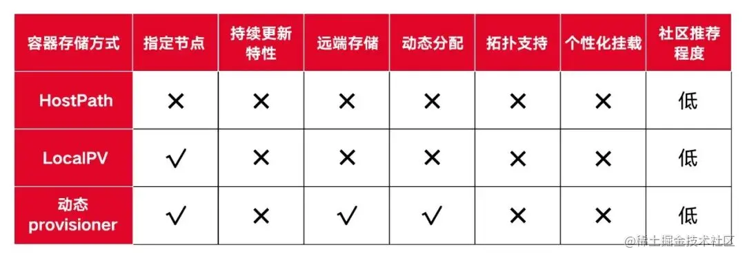传统的方式包含Hostpath、LocalPV、动态provisioner等,这些方式虽支持在K8S容器上使用容器存储,但或多或少存在一些问题,相关问题对比如下: