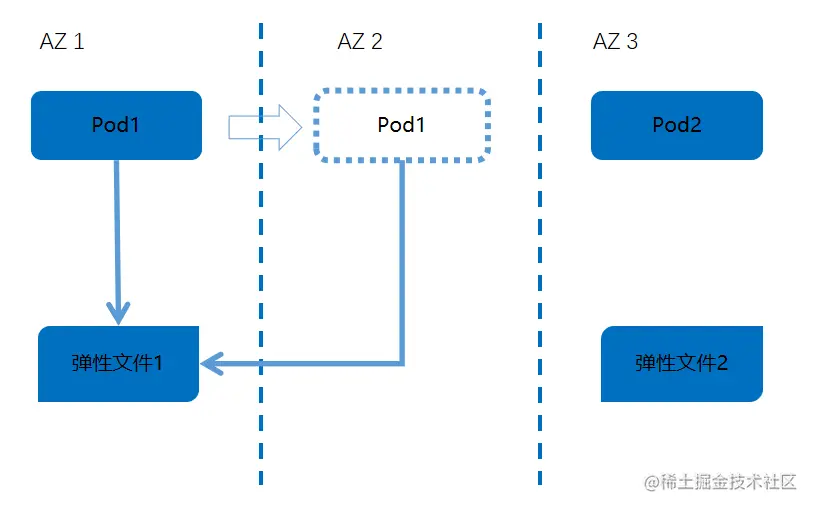 在该情况下,容器存储CStor-CSI也能够很好地支持跨AZ使用的存储资源。如图所示,不论Pod调度到哪个AZ上,天翼云都可以如影随形,为Pod提供始终如一的弹性文件服务,保证企业业务正常运行。