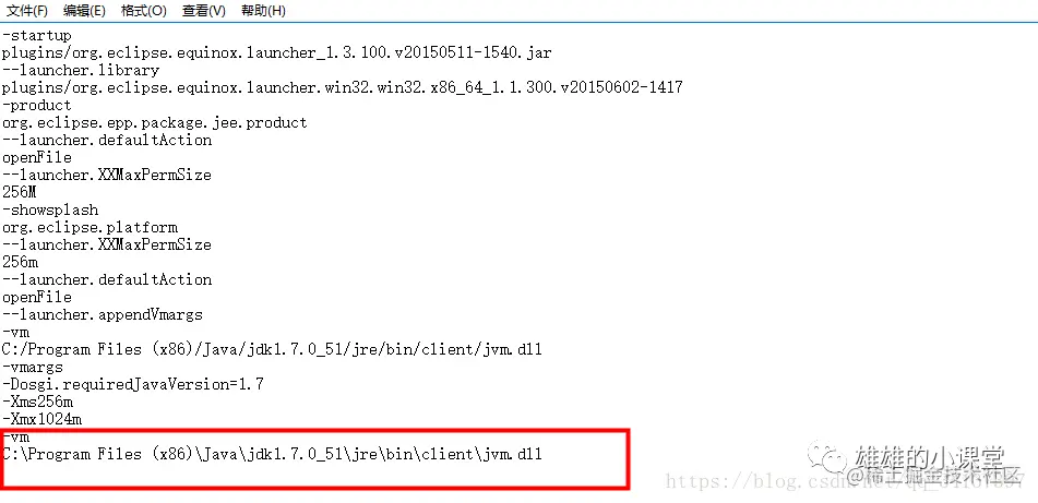 如果报错加载不到jdk的时候怎么办呢,别慌,我们用记事本打开eclipse.ini文件,