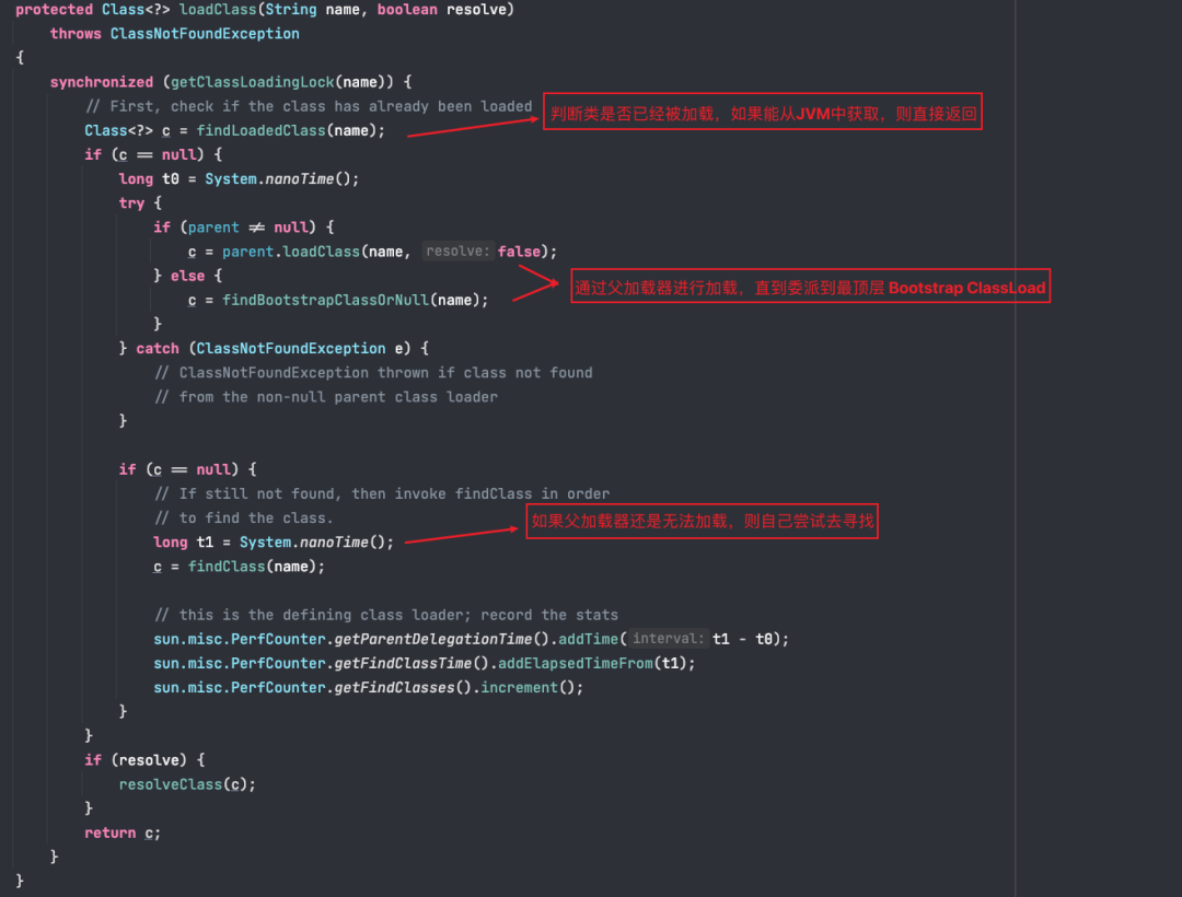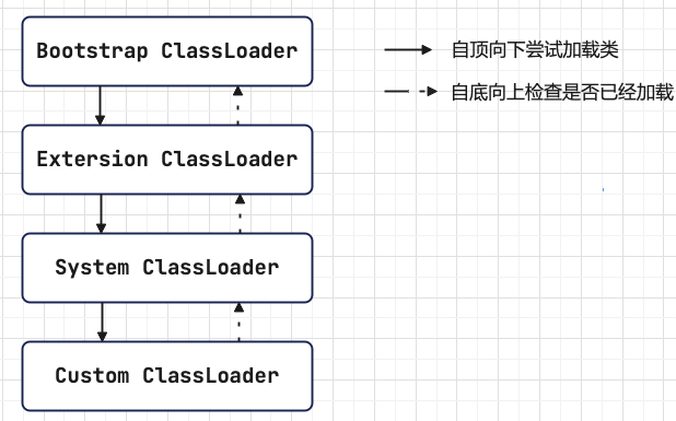 当一个类加载器收到加载类的任务时,会先交给自己的父加载器去完成,一级一级往上,因此最后都会传递到 Bootstrap ClassLoader 进行加载,只有当父加载器无法完成加载任务的时候,才会尝试自己进行加载