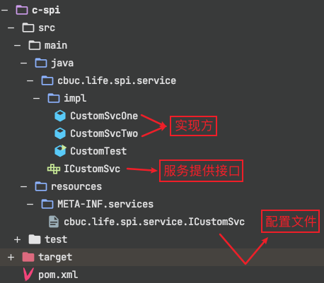 ICustomSvc:服务提供接口(也就是 SPI)CustomSvcOne/CustomSvcTwo:实现者(这里直接在一个项目中简单实现,也可以通过 jar 包导入的方式实现)cbuc.life.spi.service.ICustomSvc:配置文件
