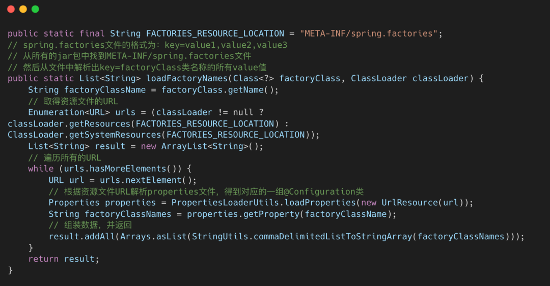 在使用 Spring Boot 中我们会将想要注入 IOC 容器的类将全类限定名写到 META-INF/spring.factories文件中,在 Spring Boot 程序启动的时候就会由 SpringFactoriesLoader 进行加载,扫描每个 jar 包 class-path 目录下的 META-INF/spring.factories 配置文件,然后解析 properties 文件,找到指定名称的配置后返回