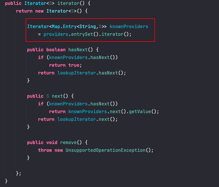 可以看到有个关键的缓存,该缓存存储 provider,每次操作的时候都会去该缓存中查找,如果存在则返回,否则采用 LazyIterator 进行查找,我们进行进入到LazyIterator类中查看如何实现,由于该类代码过长,我们直接截取关键代码,有兴趣的同学可以自行查看完整代码: