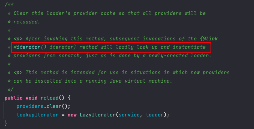 这里将注释一起截取出来,我们可以看到这句话 方法将惰性查找实例化,说明了上述说到实现 Iterable 接口的用处,我们这里可以先点进 iterator() 方法查看是如何实现的