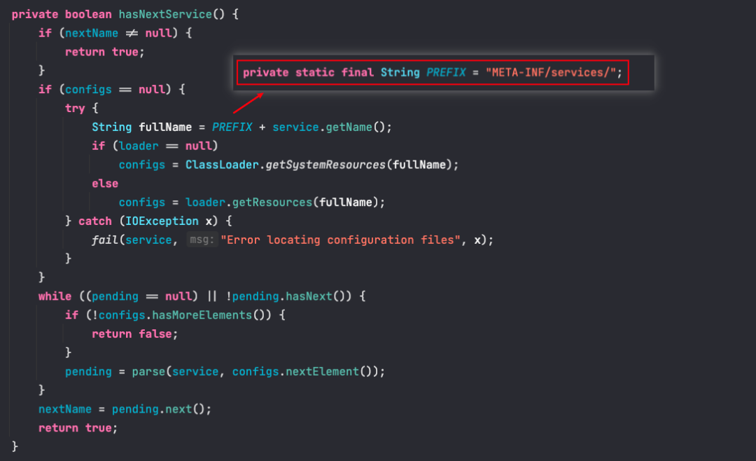 看到该代码的实现顿时豁然开朗了,我们看到了熟悉的目录名 META-INF/services/,该代码会去指定目录下获取文件资源,然后通过上传传入的线程上下文类加载器进行类加载,这样子我们的 SPI 实现类就可以供项目使用了~ 看完不得不感叹 妙啊~