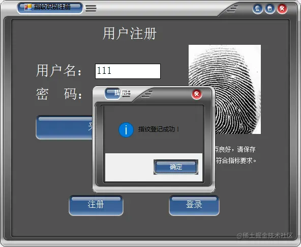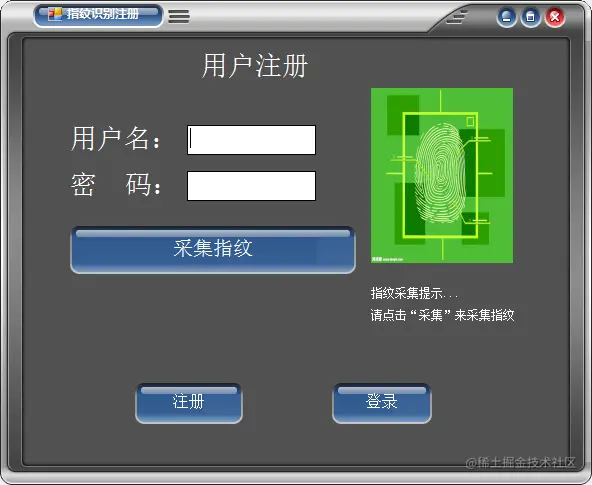 用户注册:输入用户名、密码以及采集完整的3遍指纹。