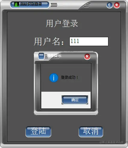 用户登录:输入注册时的用户名,使用注册时的指纹,即可登录成功。