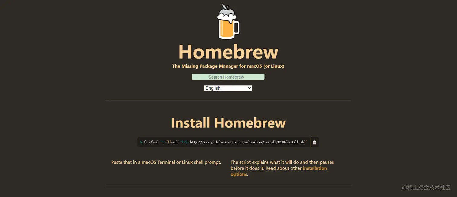 有同学可能会有疑问这个brew是什么呢,下面放上 官方的地址: brew.sh/ ,打开网址会看到下面这样一个页面,用官方的话说 :