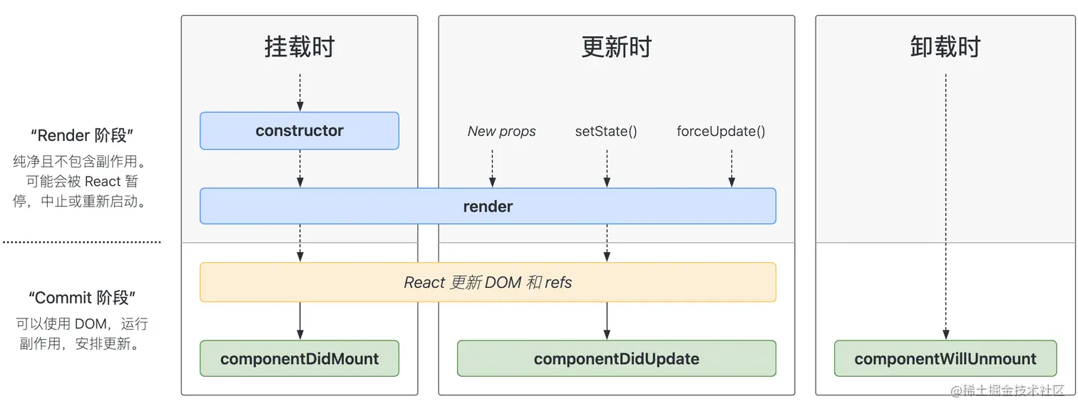 | constructor | 初始化组件状态、创建DOM引用对象、更改组件方法 this 指向等 |
