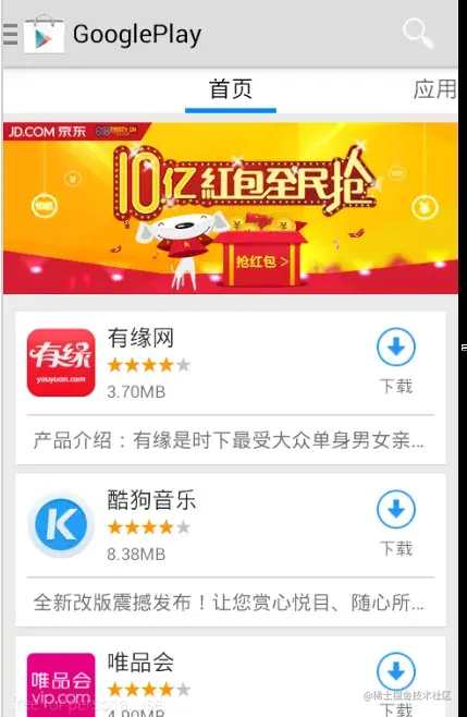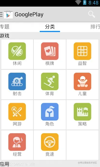 应用界面和首页有点类似,只不过没有了中间ViewPager的部分。和首页相同的代码,可以抽取到父类,这样简化了代码。