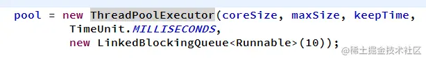 当线程池中的线程小于coreSize,直接创建新的线程加入线程池执行任务,当线程池中的线程数目等于coreSize,将会把任务放入任务队列new LinkedBlockingQueue(10)这个集合中,当BlockingQueue中的任务放满了,将会创建新的线程去执行,但是当总线程数大于maxSize时,将会抛出异常。keepAliveTime是线程执行完任务后,且队列中没有可以执行的任务,存活的时间,后面的参数TimeUnit.MILLISECONDS是时间的单位,当前代表毫秒。