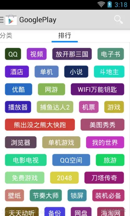 整个排行界面最外层布局是一个ScrollView,ScrollView是可以上下滚动的容器。里面包裹着一个自定义的布局(Flowlayout),这个自定义布局可以让里面的每个条目一行一行排列,如果当前行排列满了,会自动换到下一行。