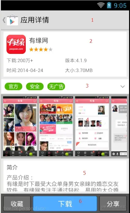 应用详情界面分为6部分实现的,如上图序号。