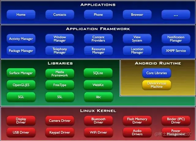 从软件的角度来看,Android平台由Linux内核、系统库、Android运行时、应用程序框架以及应用程序共5部分构成。