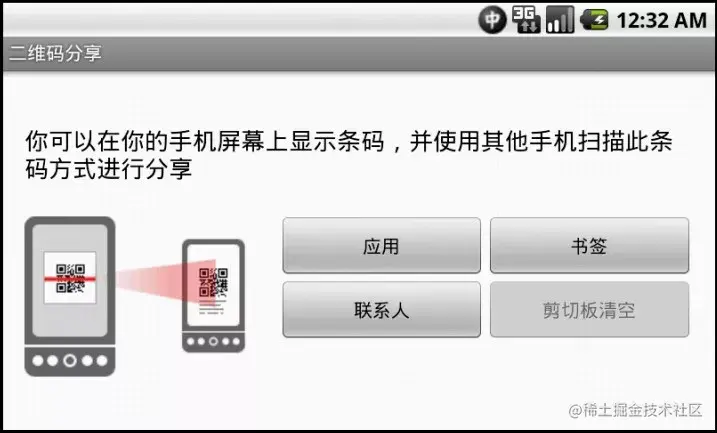 实现过程:首先在onCreateMenu()函数中添加分享选项。然后在创建的添加选项onOptionsItemSelected()函数当中添加处理函数。当分享按钮被点击时,就会调用ShareActivity,然后在ShareActivity类中添加按钮点击事件,根据用户不同的选择来调用不同的函数。其实现界面如图5-4所示: