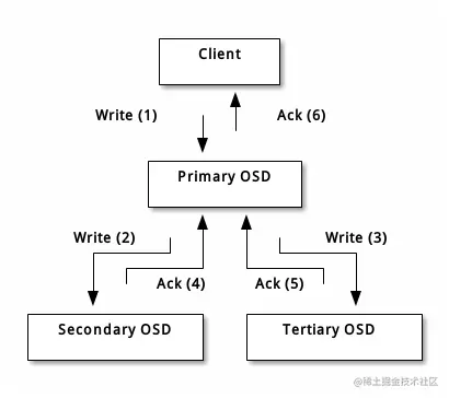 客户端把对象写入目标归置组的主 OSD ,然后这个主 OSD 再用它的 CRUSH 图副本找出用于放对象副本的第二、第三个 OSD ,并把数据复制到适当的归置组所对应的第二、第三 OSD (要多少副本就有多少 OSD ),最终,确认数据成功存储后反馈给客户端。