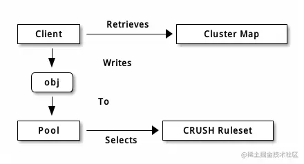 Ceph 客户端从监视器获取一张集群运行图,并把对象写入存储池。存储池的 size 或副本数、 CRUSH 规则集和归置组数量决定着 Ceph 如何放置数据。