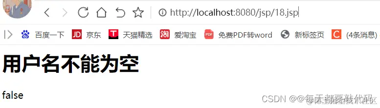 😊发送请求http://localhost:8080/jsp/18.jsp ,前端没有传入username,后端就取不到数据,调用隐式对象param.username返回的就是一个false;所以变量v取出来的也就是false