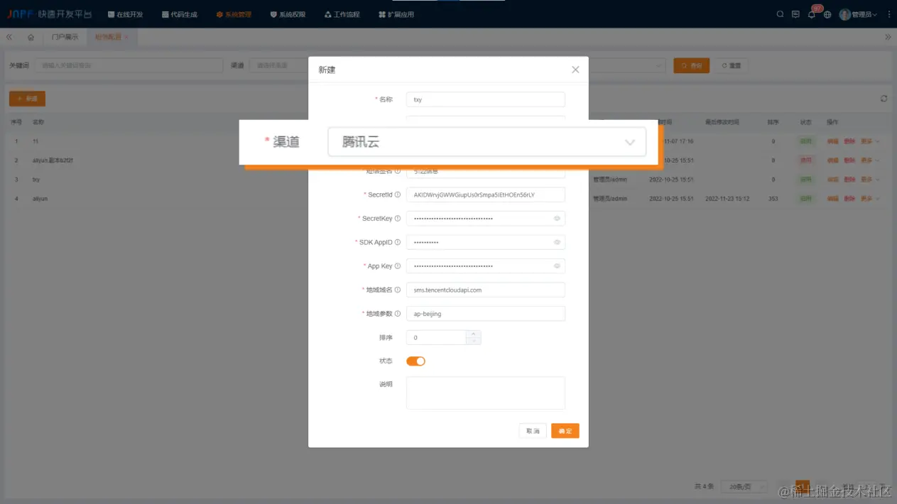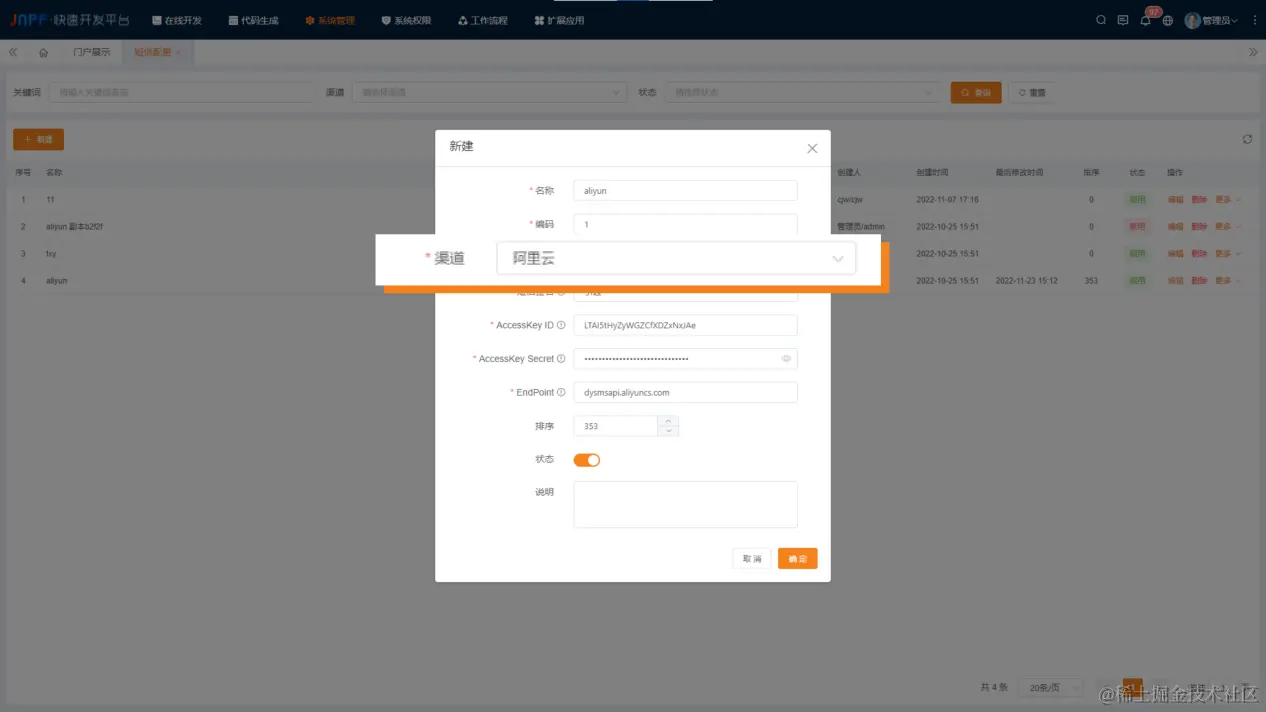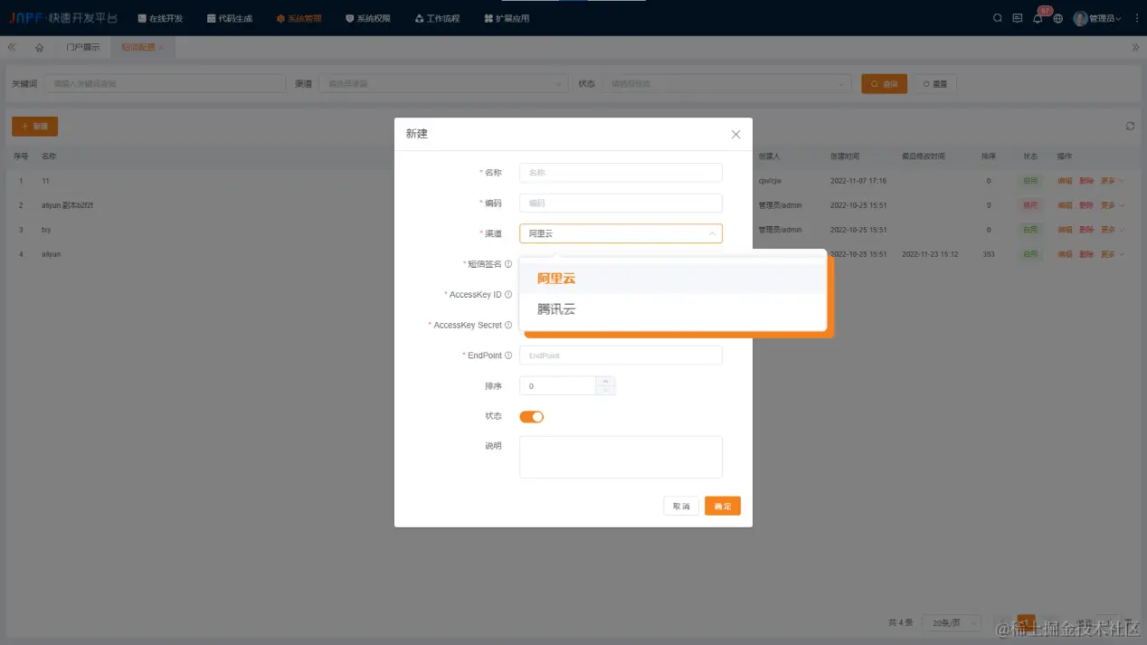 在新建窗口页面先对基础信息进行配置,如名称、编码。再对短信配置渠道进行选择,有阿里云与腾讯云可选,不同渠道所需配置的内容也不尽相同,接下来给大家一一介绍。